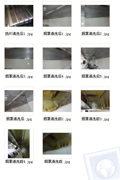 1) 烟罩烟道清洗后90%以上可以见到烟道原有的内壁铁皮色,不残留块状顽固油污;